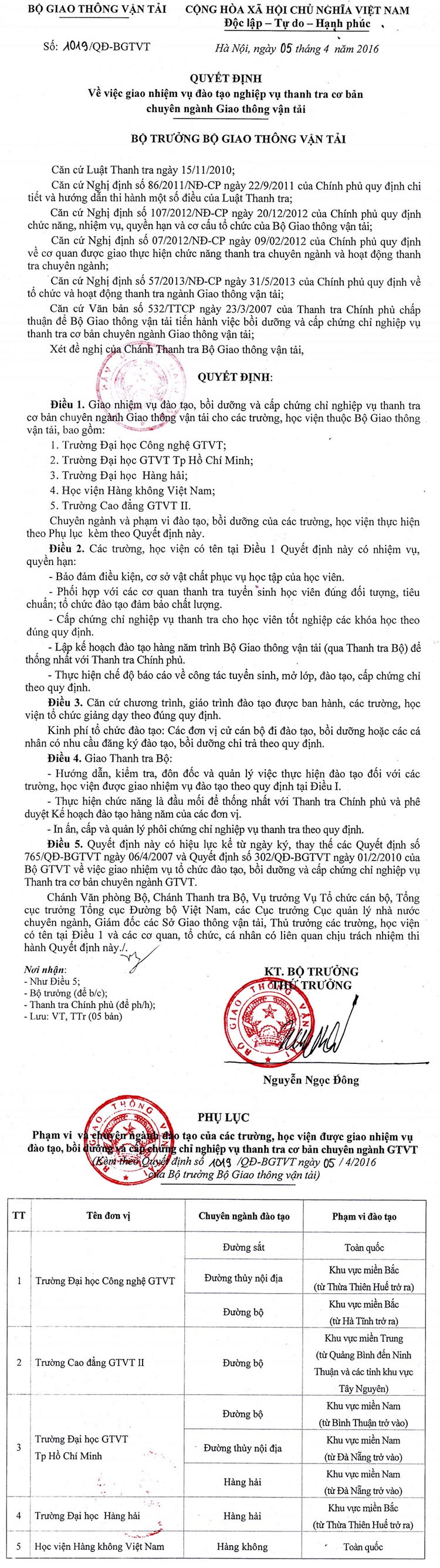 Quyết định Giao nhiệm vụ đào tạo nghiệp vụ thanh tra cơ bản chuyên ngành Giao thông vận tải 21/04/2016 18:04 File đính kèm 1019.pdf