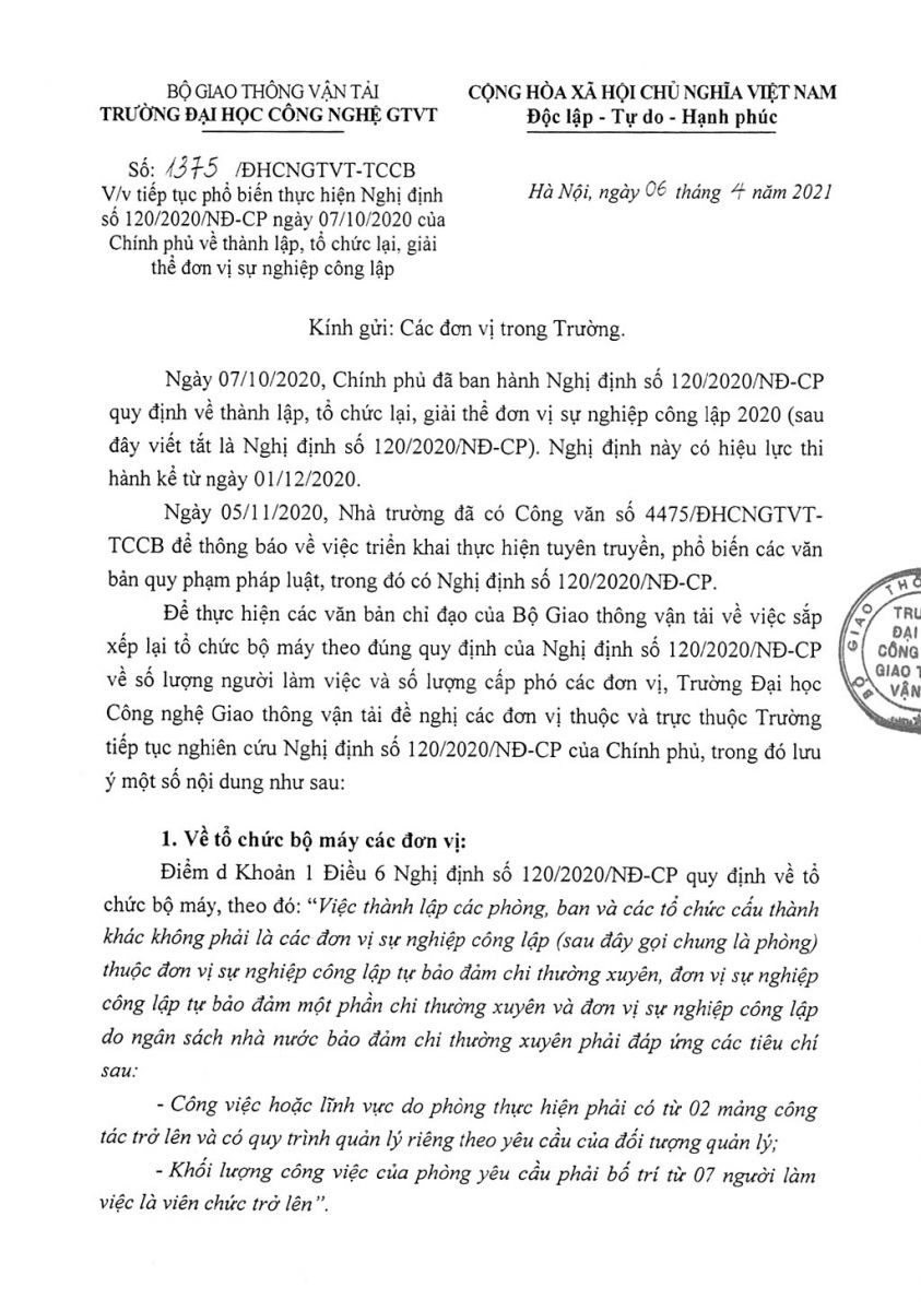 Văn bản phổ biến Nghị định số 120/2020/NĐ-CP của Chính phủ về thành lập, tổ chức lại, giải thể đơn vị sự nghiệp công lập 07/04/2021 00:04 File đính kèm 1375-DHCNGTVT-TCCB.pdf