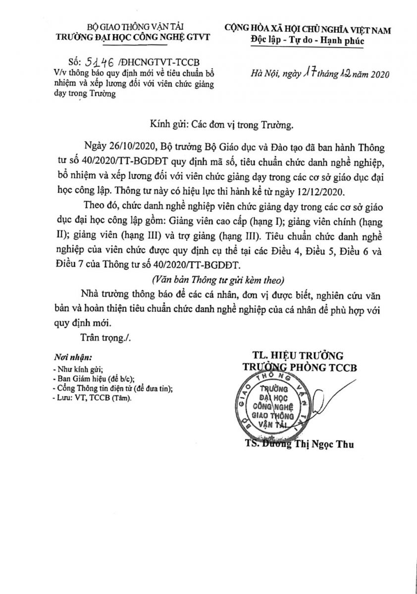 Văn bản Quy định mới về tiêu chuẩn bổ nhiệm và xếp lương đối với viên chức giảng dạy trong Trường 18/12/2020 08:12 File đính kèm thong-tu-40-2020-BGDDT.pdf
