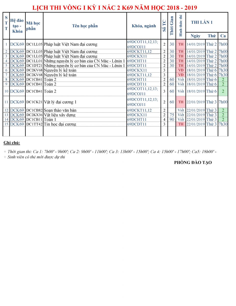 LỊCH THI KTHP K69 NẤC 2 KỲ 1 NĂM HỌC 2018 - 2019