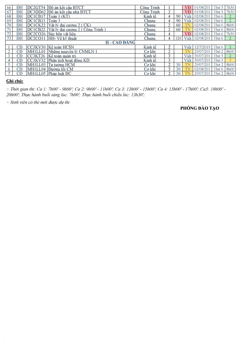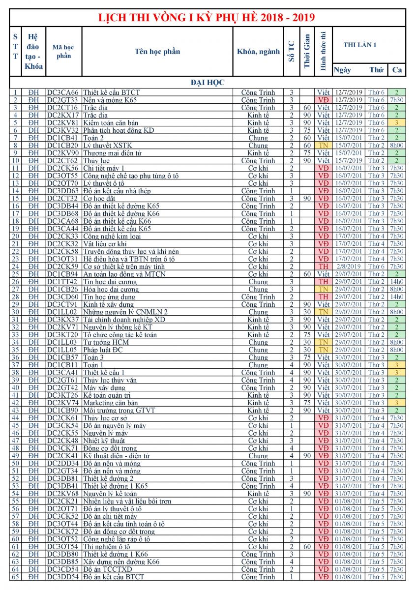 LỊCH THI KỲ PHỤ HÈ THÁNG 7 2018 - 2019