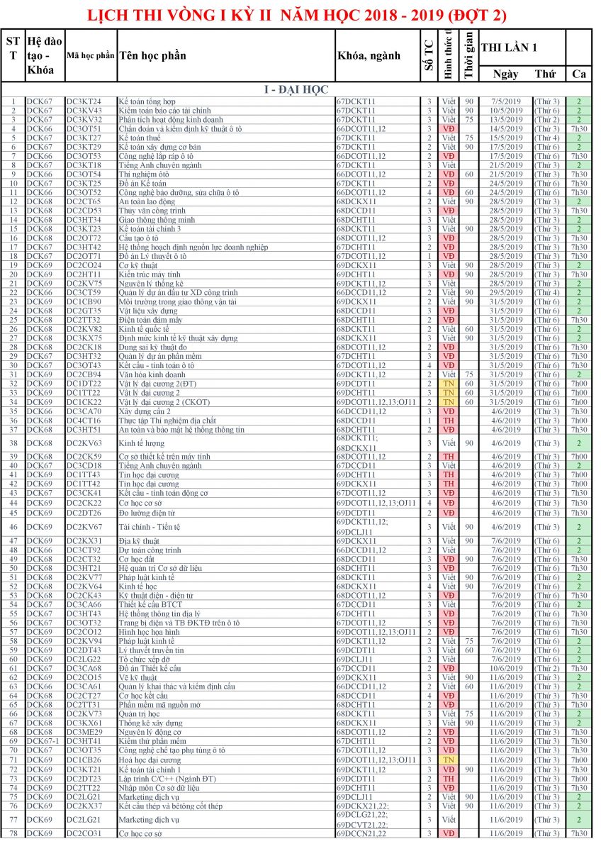 LỊCH THI VÒNG 1 KỲ 2 NĂM HỌC 2018 - 2019 ( ĐỢT 2 )