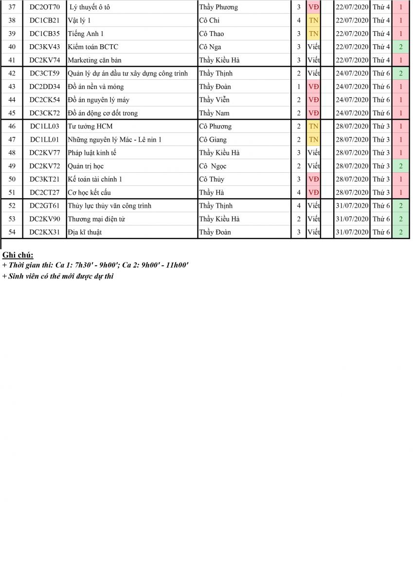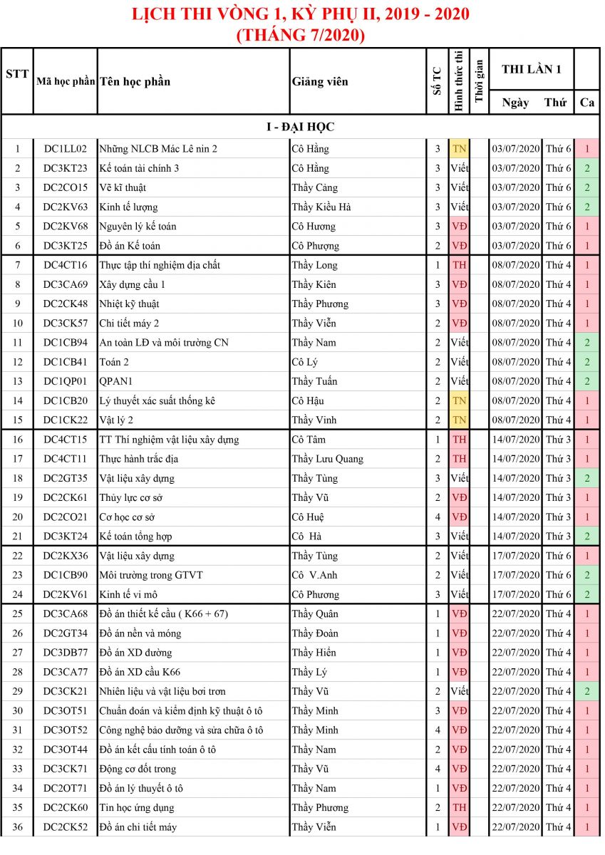 LỊCH THI VÒNG 1 - KỲ PHỤ HÈ (7/2020)