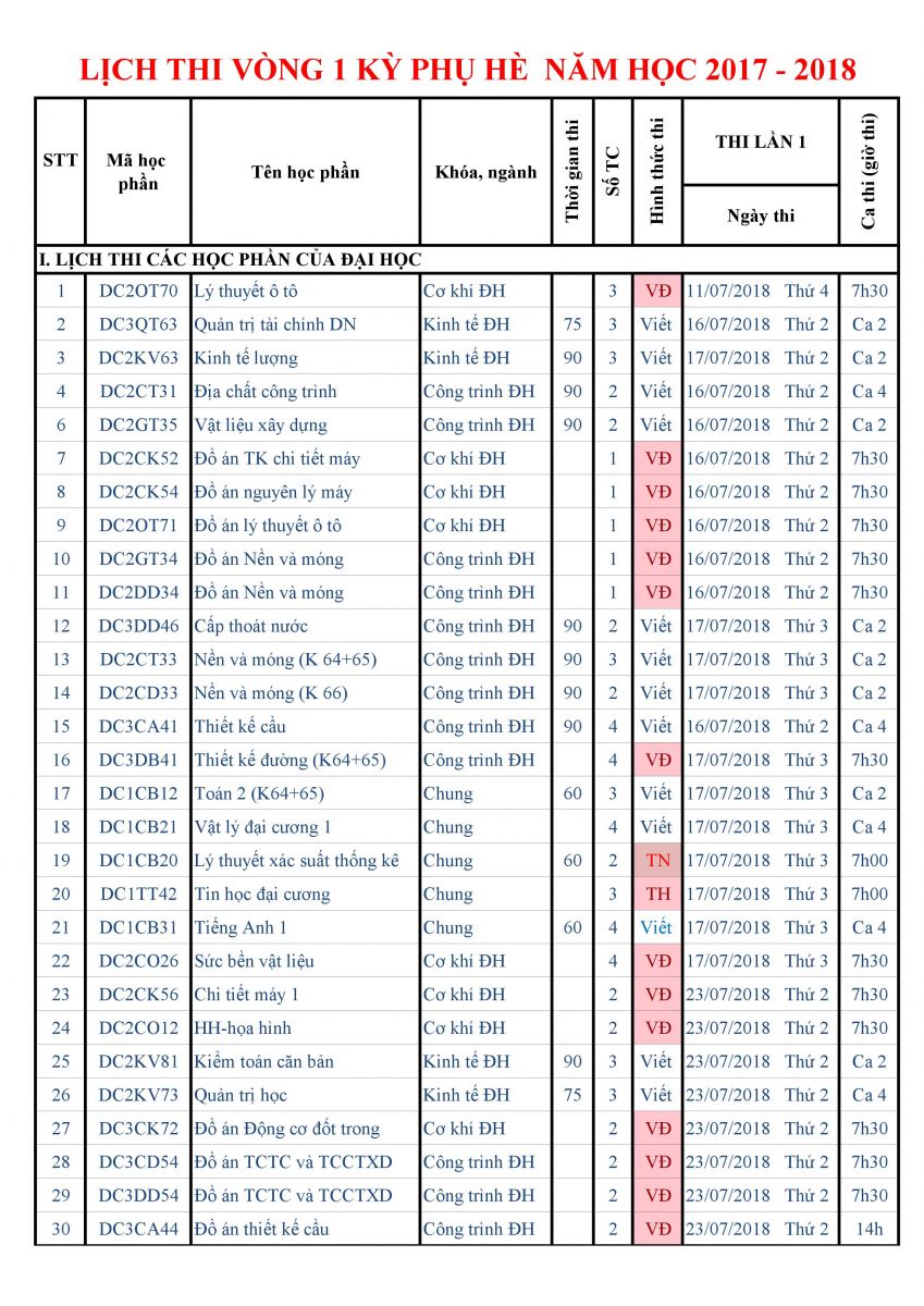 LỊCH THI VÒNG 1 KỲ PHỤ HÈ NĂM HỌC 2017 - 2018