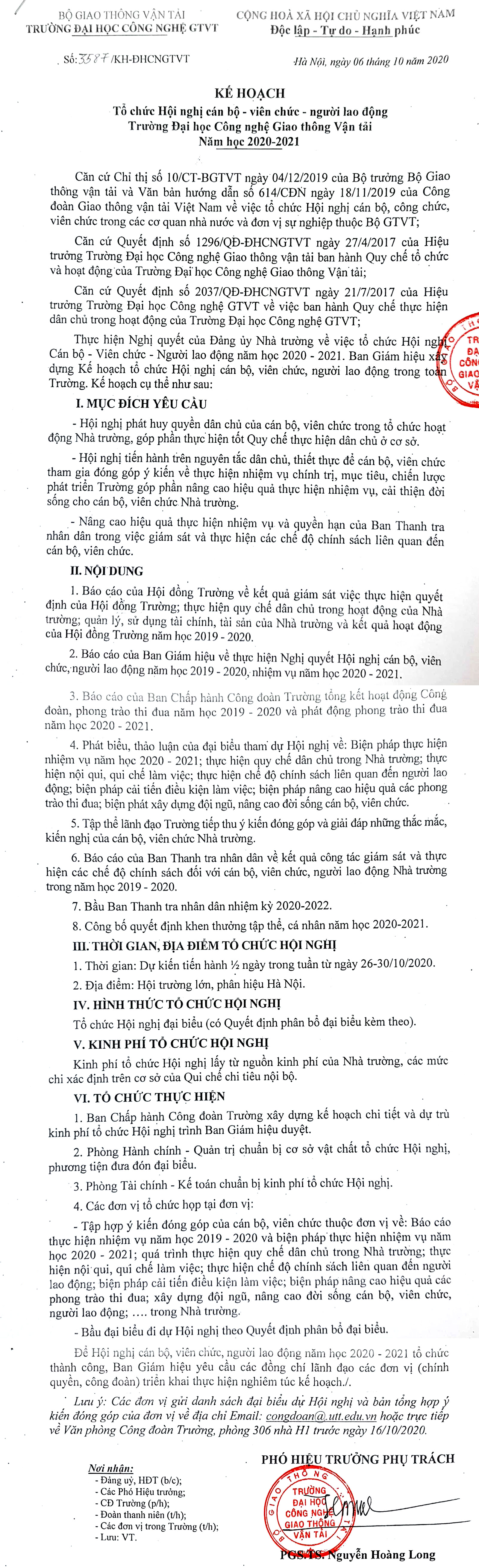 Kế hoạch Tổ chức Hội nghị cán bộ - viên chức - người lao động Trường Đại học Công nghệ Giao thông vận tải Năm học 2020-2021