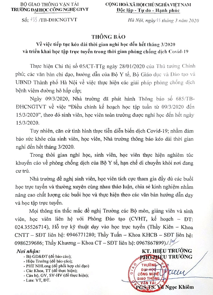 Thông báo kéo dài thời gian nghỉ học đến hết tháng 3/2020 và triển khai học tập trực tuyến