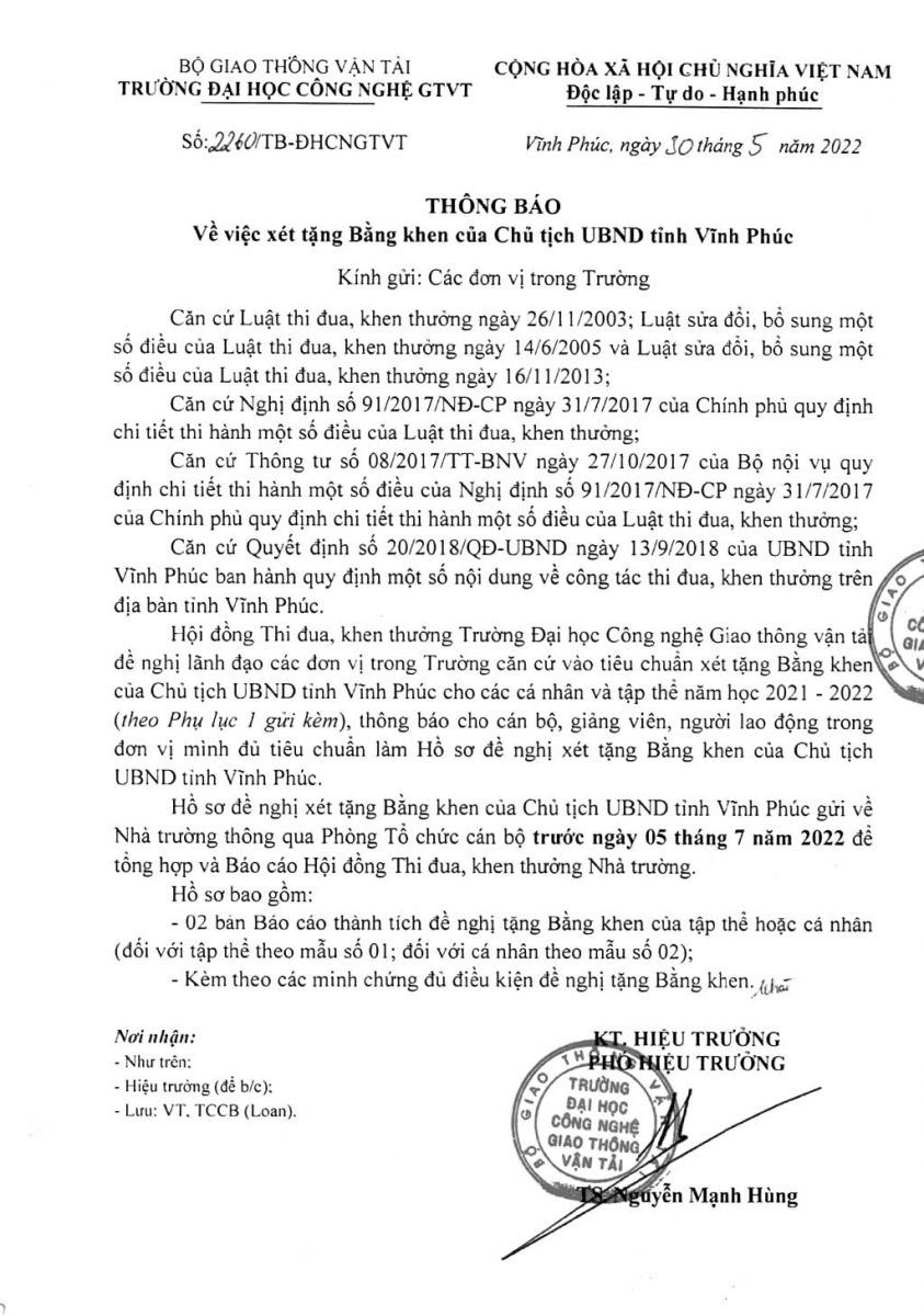 Thông báo về việc xét tặng Bằng khen của Chủ tịch UBND tỉnh Vĩnh Phúc
