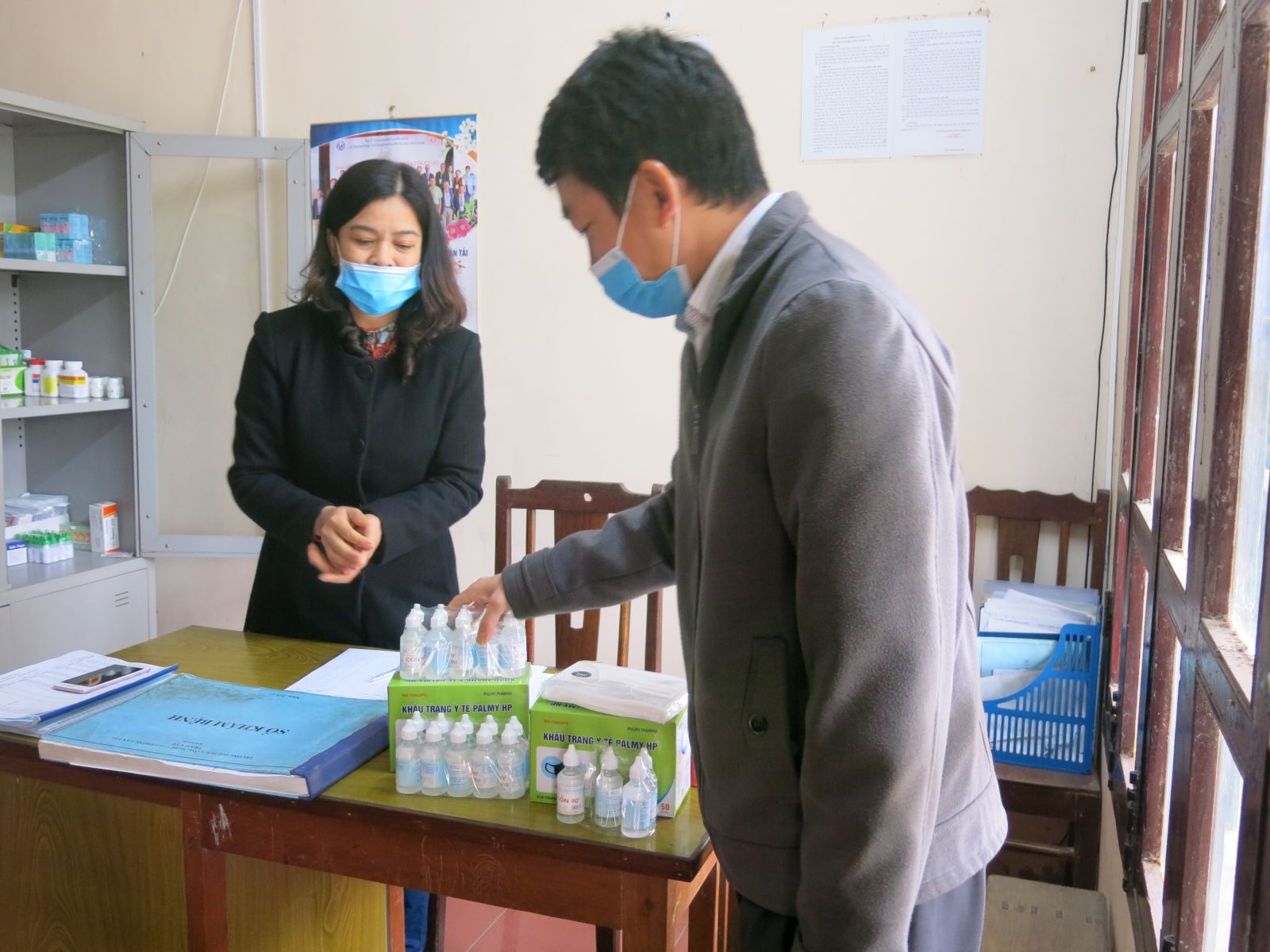Hiệu trưởng kiểm tra việc bố trí các bàn phát khẩu trang, nước rửa tay sát khuẩn, treo pano hướng dẫn thông tin cơ bản về dịch bệnh do nCoV…
