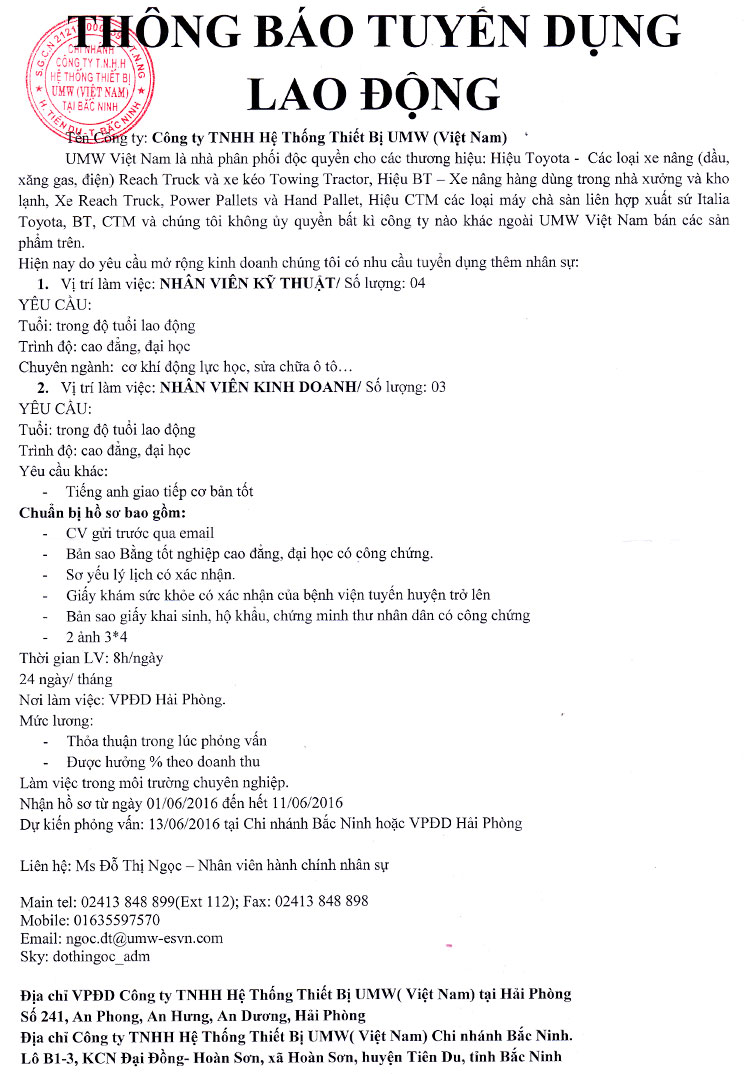 Công ty TNHH Hệ thống thiết bị UMW (Việt Nam) tuyển dụng nhân viên kỹ thuật, nhân viên kinh doanh