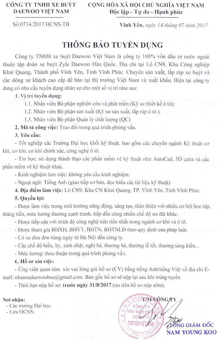 Công ty TNHH xe buýt Daewoo Việt Nam tuyển dụng nhân viên R&D, kỹ sư sản xuất làm việc tại Vĩnh Phúc