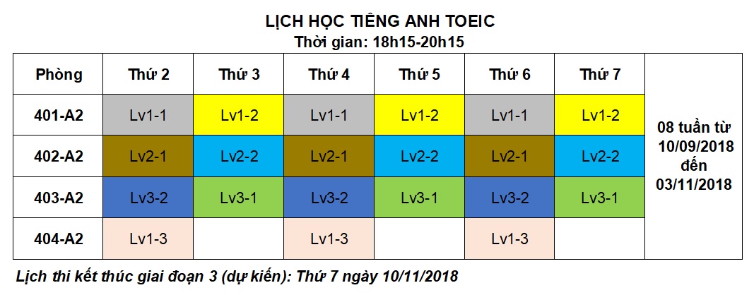 Căn cứ vào kết quả thi và bảng đăng ký các lớp trình độ TOEIC giai đoạn 3 của K66 thi ngày 13/08/2018 và của K67+68 thi ngày 04/02/2018, Khoa Công nghệ thông tin đã phân thành các lớp trình độ như sau: