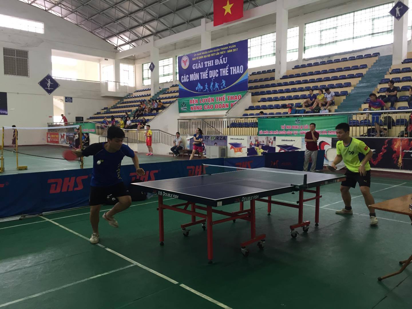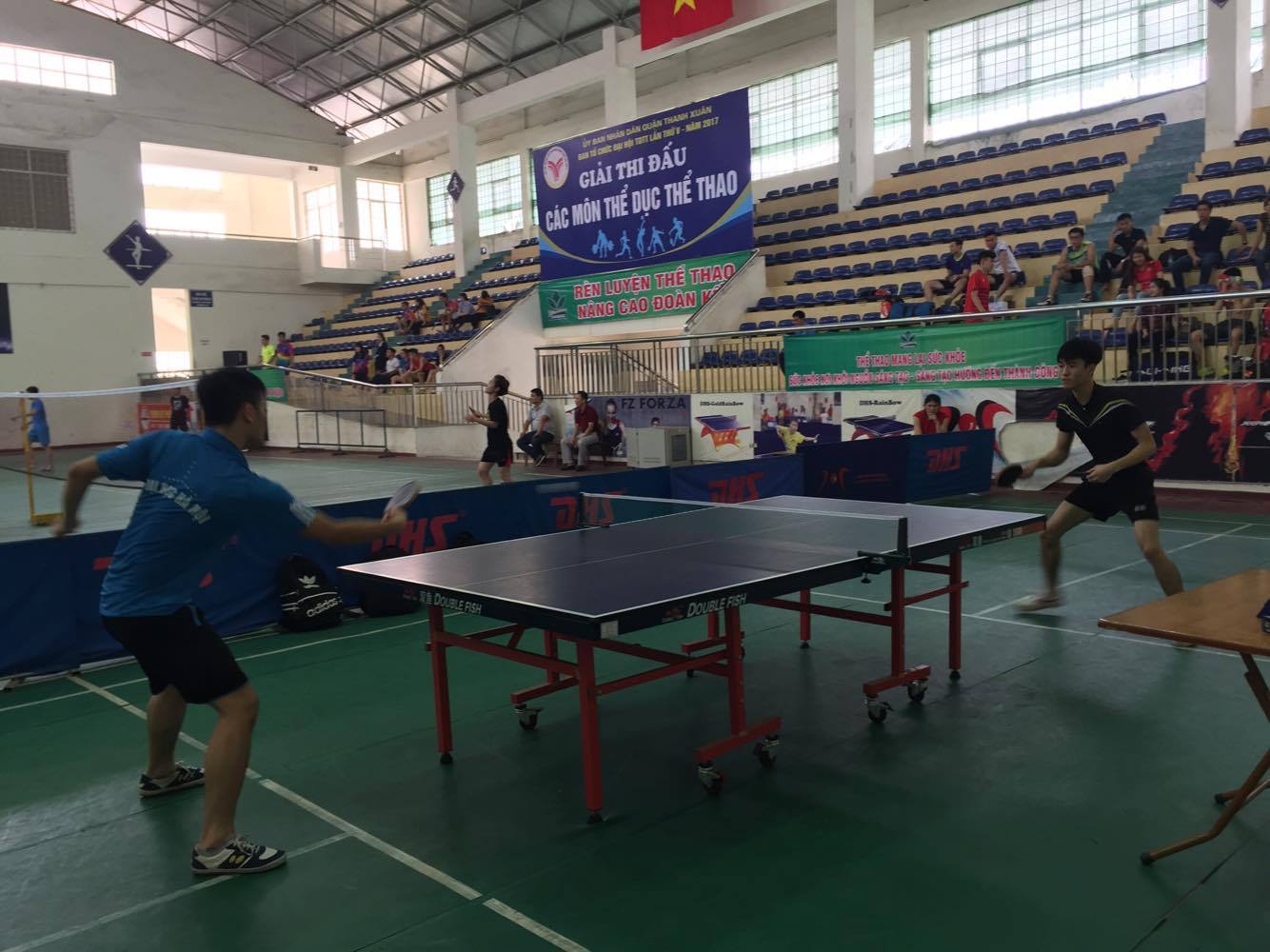 Trận thi đấu bóng bàn đơn nam của sinh viên Trần Đức Long (áo đen)
