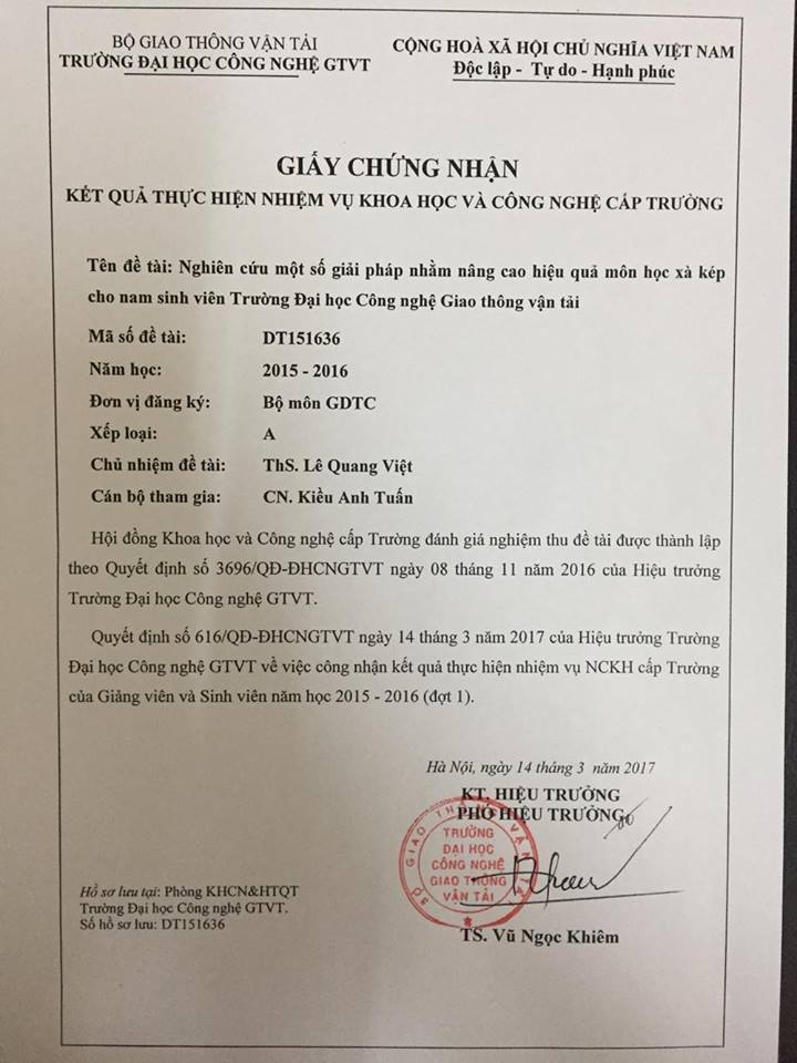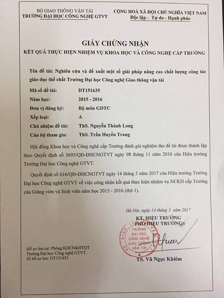 Tên đề tài: Nghiên cứu và đề xuất một số giải pháp nâng cao chất lượng công tác giáo dục thể chất Trường Đại học Công nghệ Giao thông vận tải.