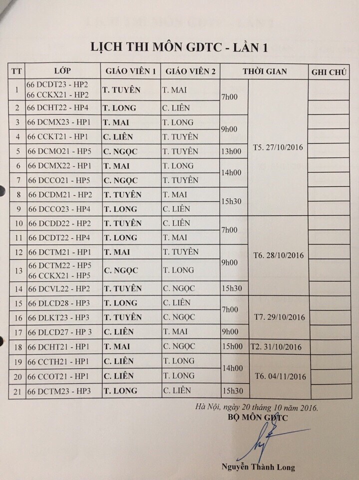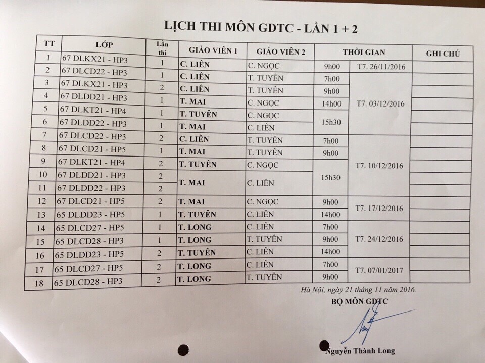 LỊCH THI MÔN GDTC. HỌC KỲ I NĂM HỌC 2018-2019