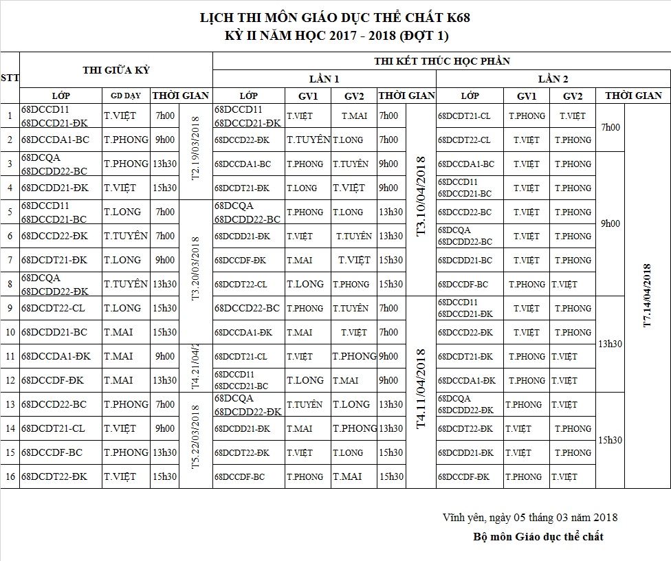 LỊCH THI GDTC KHÓA 68 HỌC KỲ II NĂM HỌC 2017 - 2018 ( ĐỢT 2)
