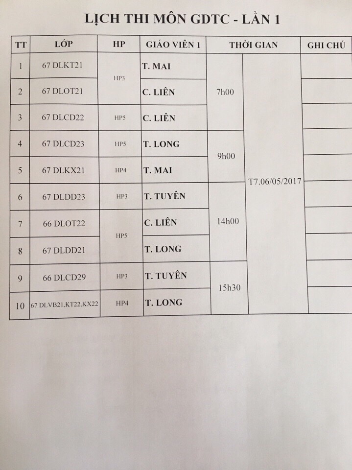LỊCH THI GDTC KHÓA 68 HỌC KỲ II NĂM HỌC 2017 - 2018 ( ĐỢT 2)