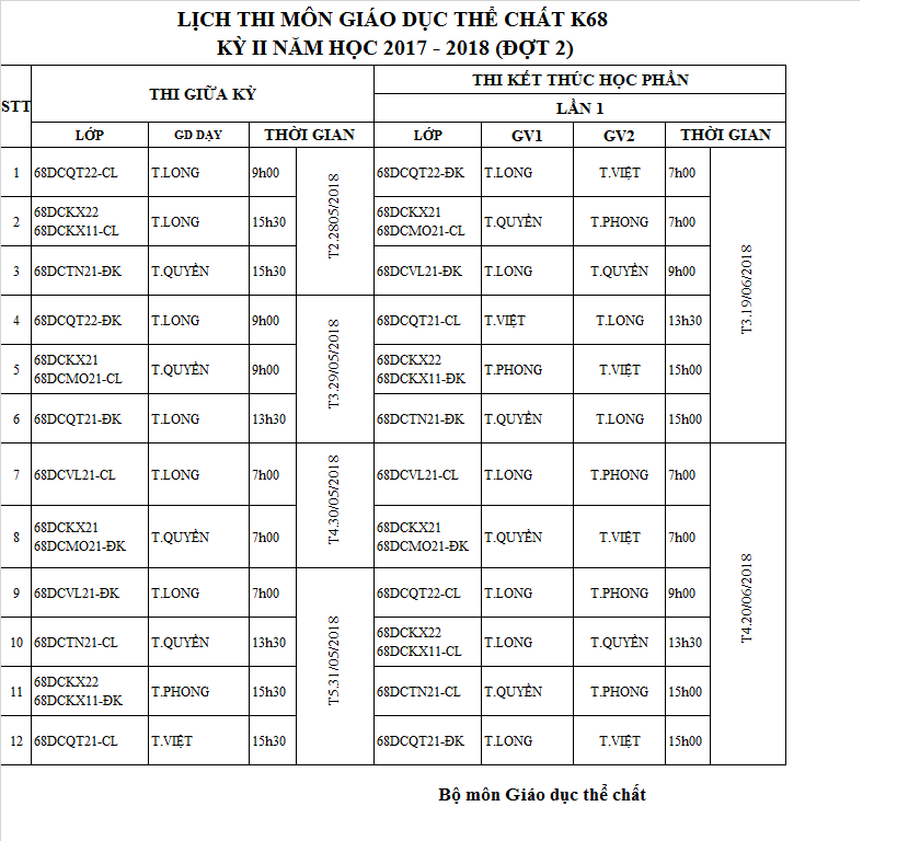 LỊCH THI GDTC KHÓA 68 HỌC KỲ II NĂM HỌC 2017 - 2018 ( ĐỢT 2)