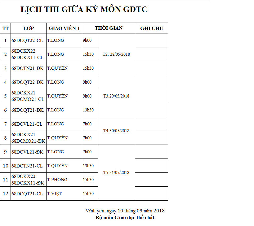 LỊCH THI MÔN HỌC GDTC KỲ II NĂM HỌC 2018-2019 ( CSĐT VĨNH PHÚC)
