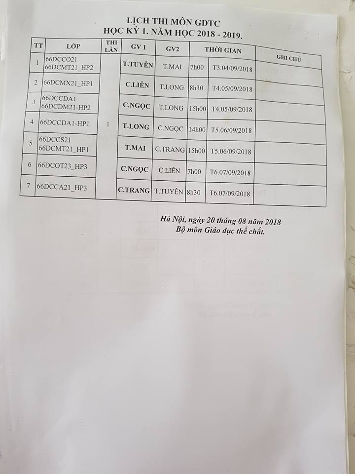 LỊCH THI MÔN GDTC. HỌC KỲ I NĂM HỌC 2018-2019