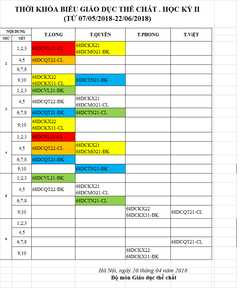LỊCH THI GDTC KHÓA 68 HỌC KỲ II NĂM HỌC 2017 - 2018 ( ĐỢT 2)