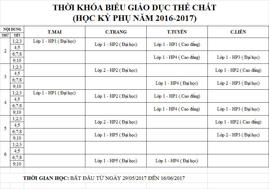 THỜI KHÓA BIỂU MÔN GIÁO DỤC THỂ CHẤT ( HỌC KỲ PHỤ NĂM 2016-2017)