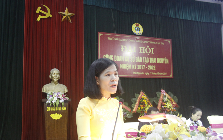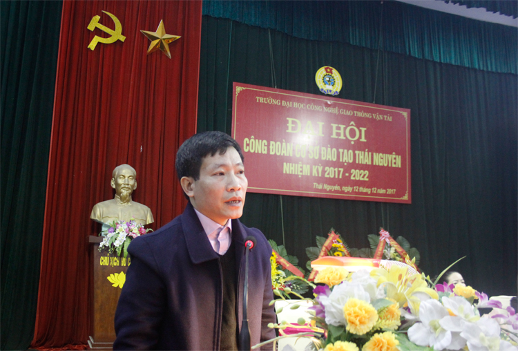 Sáng ngày 12/12/2017, Công đoàn Cơ sở Đào tạo Thái Nguyên- Trường Đại học Công nghệ GTVT đã tổ chức Đại hội nhiệm kỳ 2017 – 2022. Tham dự và chỉ đạo Đại hội, về phía lãnh đạo Nhà trường có đồng chí Nguyễn Hoàng Long- Phó Bí thư Đảng ủy, Phó Hiệu trưởng Nhà trường, Bí thư Đảng bộ bộ phận Cơ sở Thái Nguyên và đồng chí Lê Thu Sao- Chủ tịch Công đoàn Trường; về phía Cơ sở đào tạo Thái Nguyên, có đồng chí Lê Thành Long- Phó Giám độc Phụ trách Cơ sở, đồng chí Lê Thị Hồng Điệp- Chủ tịch Công đoàn Cơ sở, đồng chí Trịnh Minh Hoàng- Bí thư Đoàn thanh niên Cơ sở cùng đông đủ đại biểu là đoàn viên công đoàn Cơ sở.