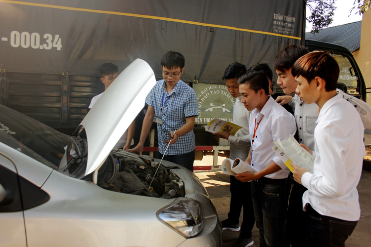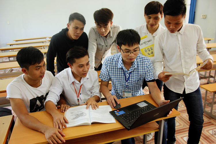 Phạm Tiến Đạt (đứng giứa) và các bạn trong giờ học Chi tiết máy