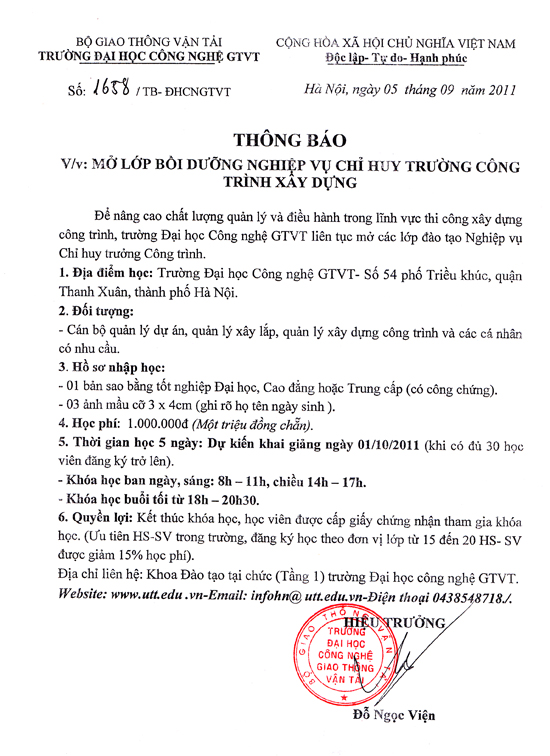 Thông báo mở lớp bồi dưỡng nghiệp vụ chỉ huy công trưởng công trình xây dựng 26/09/2011 00:09 Gửi Email bài này