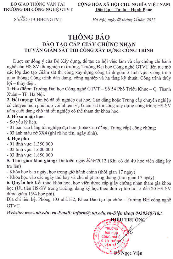 Thông báo mở lớp đào tạo cấp giấy chứng nhận tư vấn giám sát thi công xây dựng công trình 06/06/2012 00:06