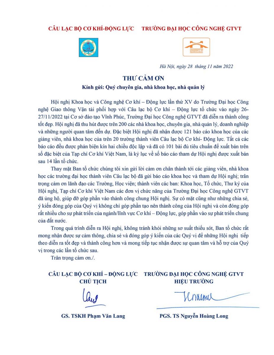 4. Thư cảm ơn của Ban tổ chức Hội nghị khoa học và công nghệ Cơ khí - Động lực lần thứ XV
