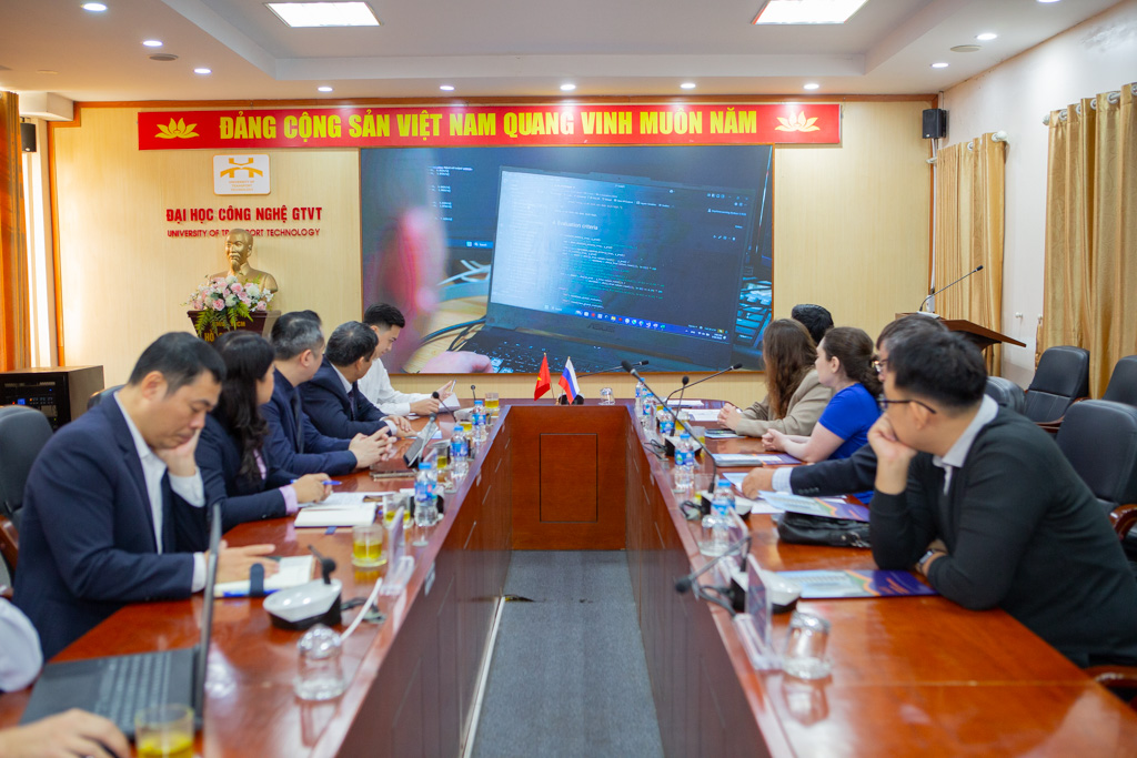 Sáng ngày 18/12/2025, tại Trường Đại học Công nghệ GTVT (UTT) đã diễn ra buổi làm việc với Đoàn đại biểu các trường đại học Liên bang Nga, nhằm trao đổi và thúc đẩy hợp tác trong lĩnh vực đào tạo, nghiên cứu khoa học và hợp tác quốc tế. Tiếp đoàn, về phía Nhà trường có PGS.TS. Ngô Thị Thanh Hương – Phó Chủ tịch Hội đồng Trường, Trưởng phòng KHCN&HTQT; TS. Lê Chí Luận – Trưởng khoa Công nghệ thông tin; TS. Đỗ Xuân Thu - Phó Trưởng khoa Công nghệ thông tin cùng đại diện lãnh đạo các đơn vị, các chuyên gia, nhà khoa học đã từng học tập và công tác tại Liên bang Nga.