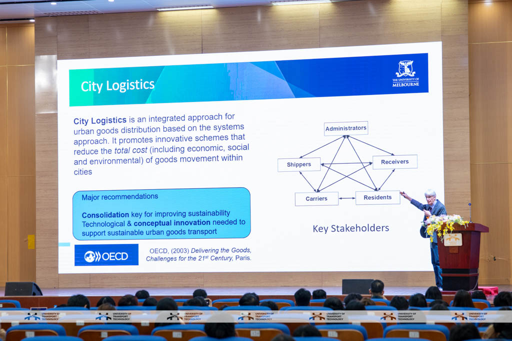 Hội thảo có sự góp mặt của các diễn giả: GS. Russell Thompson - Đại học Melbourne (Úc), chuyên gia trong lĩnh vực logistics đô thị; PGS.TS. Nguyễn Minh Hiếu - Trường Đại học GTVT; và TS. Trương Thị Mỹ Thanh - Khoa Công trình, Trường Đại học Công nghệ GTVT. Các báo cáo tập trung phân tích cơ hội và thách thức của logistics đô thị trong bối cảnh thương mại điện tử tăng trưởng mạnh và nhu cầu vận chuyển “giao hàng chặng cuối” tăng mạnh.