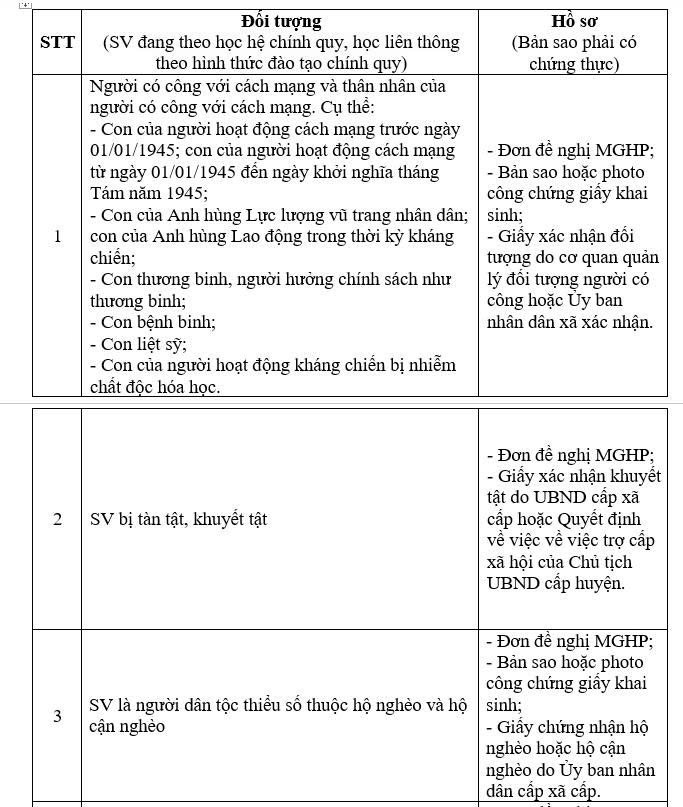 Thông báo về việc miễn, giảm học phí và hỗ trợ chi phí học tập cho sinh viên diện chính sách