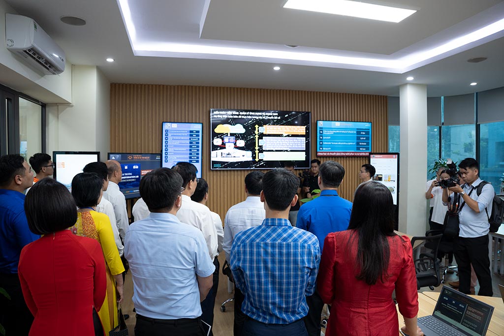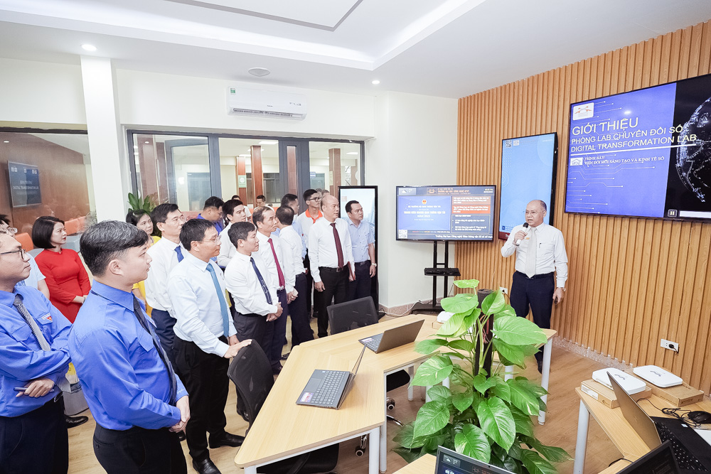Các đại biểu được giới thiệu và trải nghiệm nền tảng hạ tầng công nghệ số hiện đại đang được Trung tâm nghiên cứu ứng dụng tại Trường