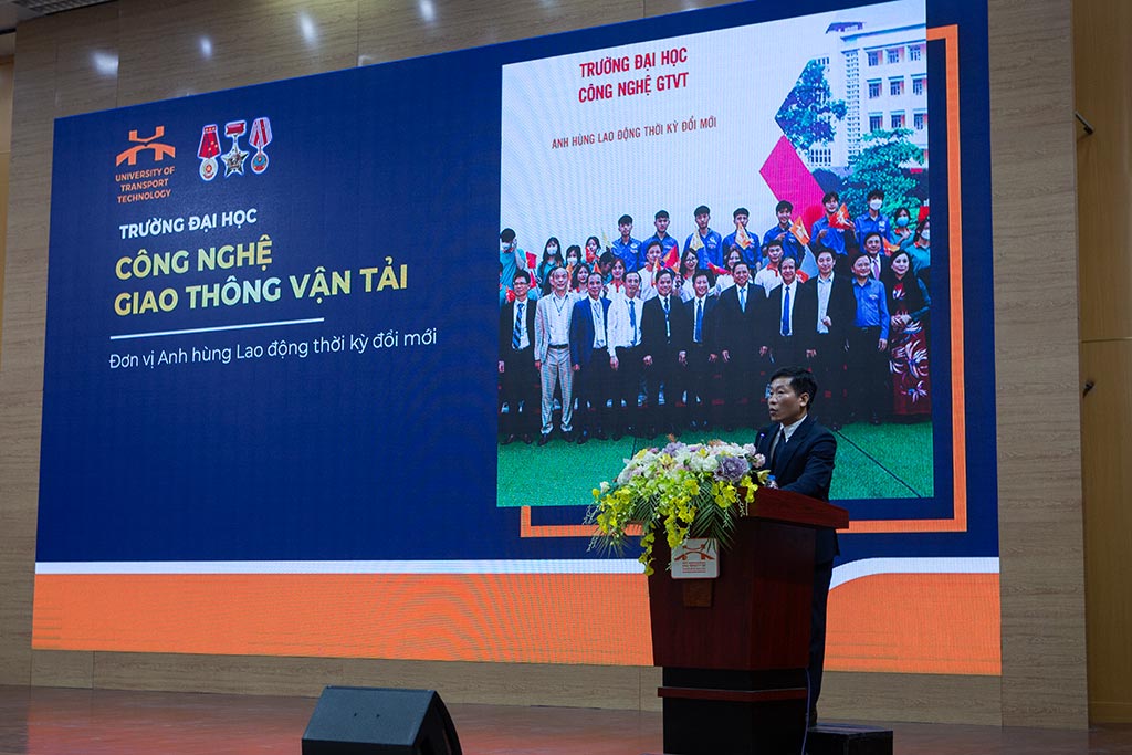 PGS.TS Nguyễn Hoàng Long - Hiệu trưởng, Chủ tịch Hội đồng TĐG Trường Đại học Công nghệ GTVT trình bày tổng quan 11 CTĐT