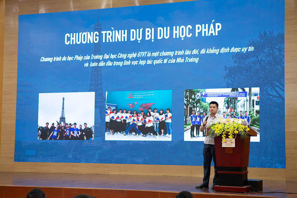 Tại Hội nghị, TS. Nguyễn Long Khánh- Giám đốc Trung tâm đào tạo và tư vấn du học việc làm quốc tế đã có những chia sẻ về cơ hội học tập và làm việc tại nước ngoài cho sinh viên UTT. Hiện tại, Trung tâm đang cung cấp nhiều chương trình du học, làm việc tại nhiều nước trên thế giới với điển hình như các chương trình tại Pháp, Nhật, Ba Lan… Đặc biệt, tại Pháp có rất nhiều đối tác của Trường Đại học công nghệ GTVT là các trường đại học lớn, nổi tiếng trên thế giới. Với chi phí vô cùng ưu đãi và chương trình đào tạo, thời gian đào tạo rất hợp lý dành riêng cho các em sinh viên Khoa Công trình của UTT khi tham gia du học tại Pháp. Trung tâm hy vọng các em luôn chủ động tìm kiếm cho mình các cơ hội để có thể phát triển bản thân mình trong tương lai.