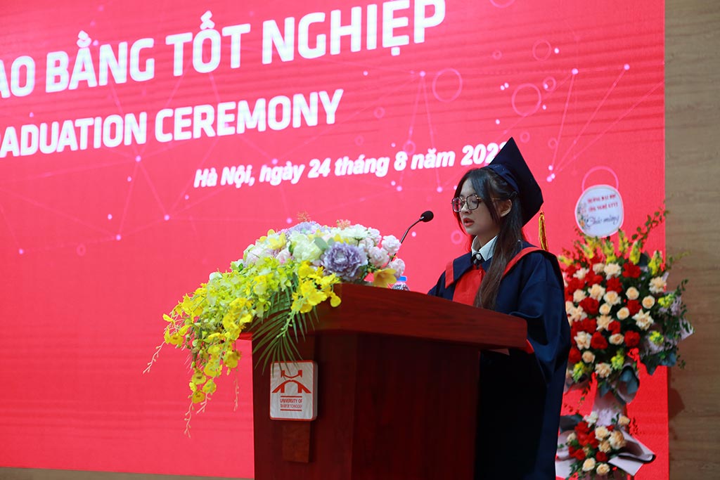 Xúc động trong buổi Lễ, thay mặt các bạn sinh viên nhận bằng tốt nghiệp đợt tháng 8 năm 2023, em Mai Thị Lan, lớp 70DCKT2, Khoa Kinh tế vận tải gửi lời cảm ơn đến các thầy, cô giáo đã luôn dìu dắt các em để có được ngày hôm nay. Chúng em xin hứa sẽ luôn phấn đấu hết mình để trở thành những công dân có ích cho xã hội.