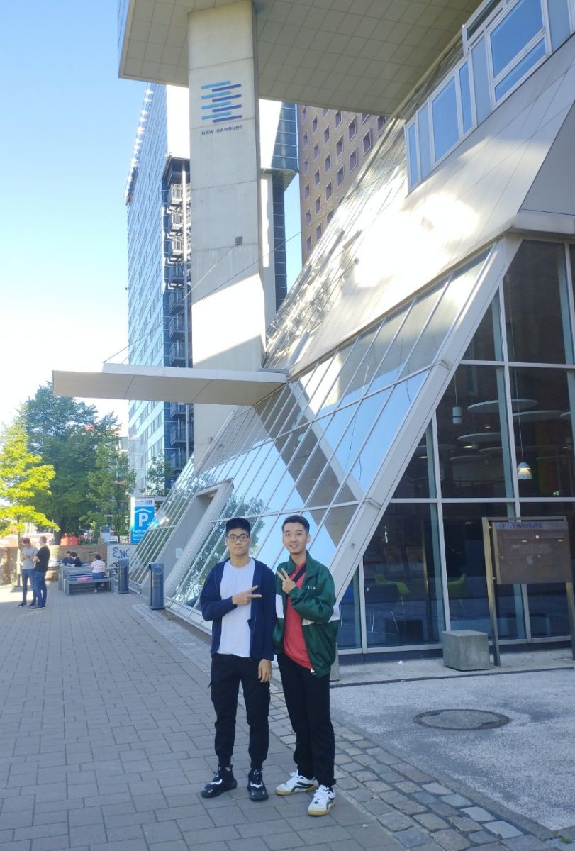 Ảnh hai bạn chụp trước tòa nhà Khoa Công nghệ và Khoa học máy tính, Trường Đại học Khoa học Ứng dụng Hamburg