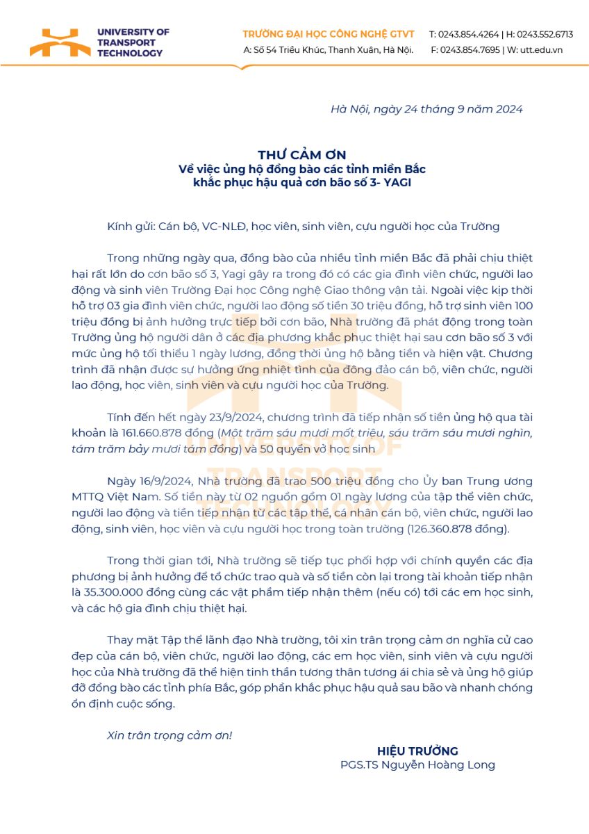 Thư cảm ơn nghĩa cử cao đẹp ủng hộ người dân miền Bắc bị ảnh hưởng bởi cơn bão số 3 25/09/2024 15:09 File đính kèm Sao-ke-tiep-nhan-ung-ho-dong-bao-bao-lu.pdf Thu-cam-on-cua-MTTQVN.jpg Tin liên quan Trường Đại học Công nghệ GTVT có 6 nhà giáo đạt chuẩn PGS năm 2025 28/11/2025 UTT đón và làm việc với Đoàn đại biểu Công đoàn Xây dựng và Công nghiệp sản xuất vật liệu xây dựng Belarus 20/11/2025 Trường Đại học Công nghệ GTVT kỷ niệm 80 năm xây dựng và phát triển: Dấu ấn truyền thống - Khát vọng vươn xa 17/11/2025 Trường Đại học Công nghệ GTVT khánh thành Tòa nhà đa năng 11 tầng và Phòng thí nghiệm ITS, BIM - AI 17/11/2025 Giao lưu văn nghệ CB-VC-NLĐ trường Đại học Công nghệ GTVT: Sân khấu của Sức sống, Tinh thần và Bản sắc UTT 15/11/2025 Ấm áp buổi gặp mặt tri ân cựu CB-VC-NLĐ Nhà trường qua các thời kỳ nhân kỷ niệm 80 năm ngày thành lập Trường 14/11/2025