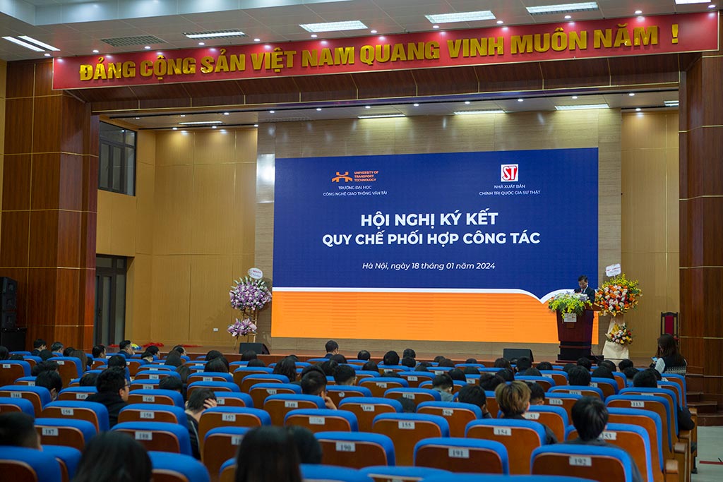 Chiều 18/01, tại Hội trường lớn phân hiệu Hà Nội, Trường Đại học Công nghệ Giao thông vận tải đã tổ chức Hội nghị ký kết Quy chế phối hợp công tác với Nhà xuất bản Chính trị quốc gia Sự thật nhằm phát huy tiềm năng, thế mạnh trong thực hiện nhiệm vụ chính trị, công tác chuyên môn của mỗi cơ quan. Đồng chủ trì Hội nghị có các đồng chí: PGS.TS. Vũ Trọng Lâm, Giám đốc - Tổng Biên tập Nhà xuất bản Chính trị quốc gia Sự thật và PGS.TS. Nguyễn Hoàng Long, Hiệu trưởng Nhà trường.