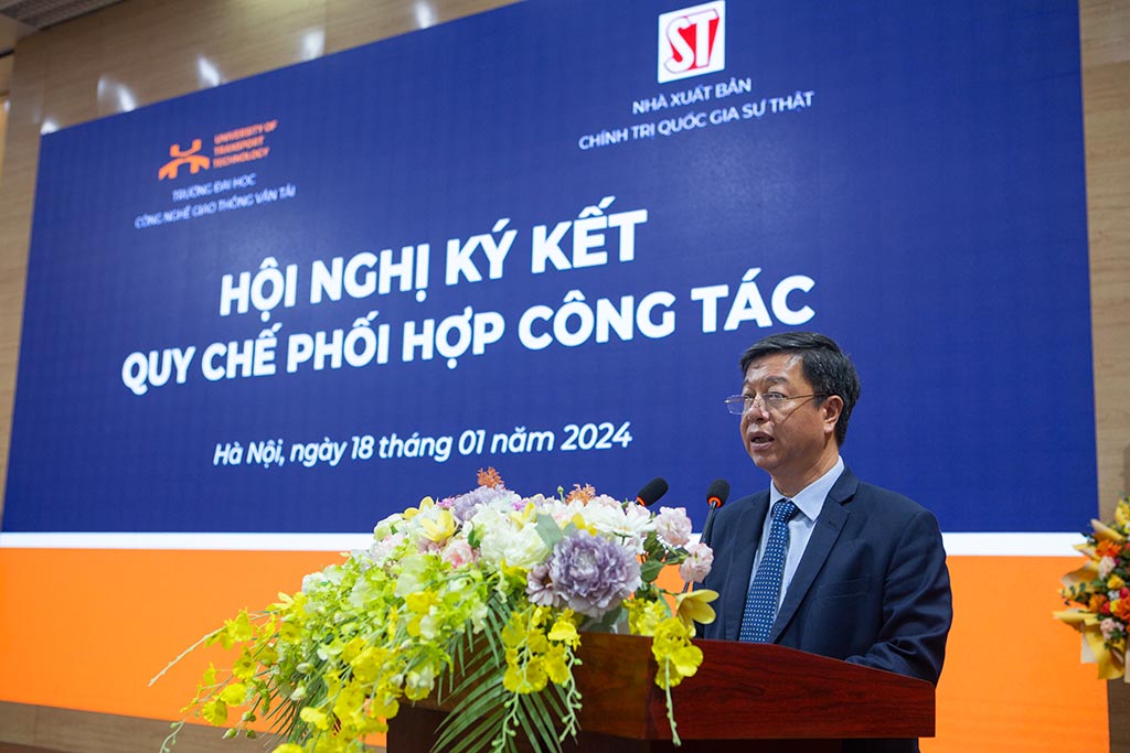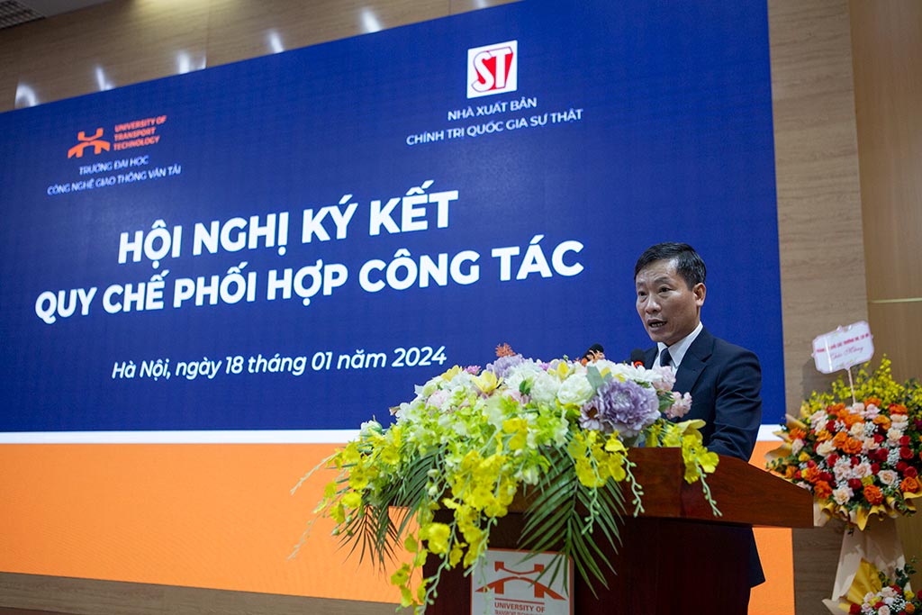 Phát biểu ý kiến tại hội nghị, PGS. TS Vũ Trọng Lâm, Giám đốc - Tổng Biên tập Nhà xuất bản Chính trị quốc gia Sự thật bày tỏ vui mừng trước sự mở rộng và nâng tầm mối quan hệ phối hợp công tác giữa Nhà xuất bản và Trường Đại học Công nghệ Giao thông vận tải - một địa chỉ đào tạo uy tín của Bộ Giao thông vận tải.