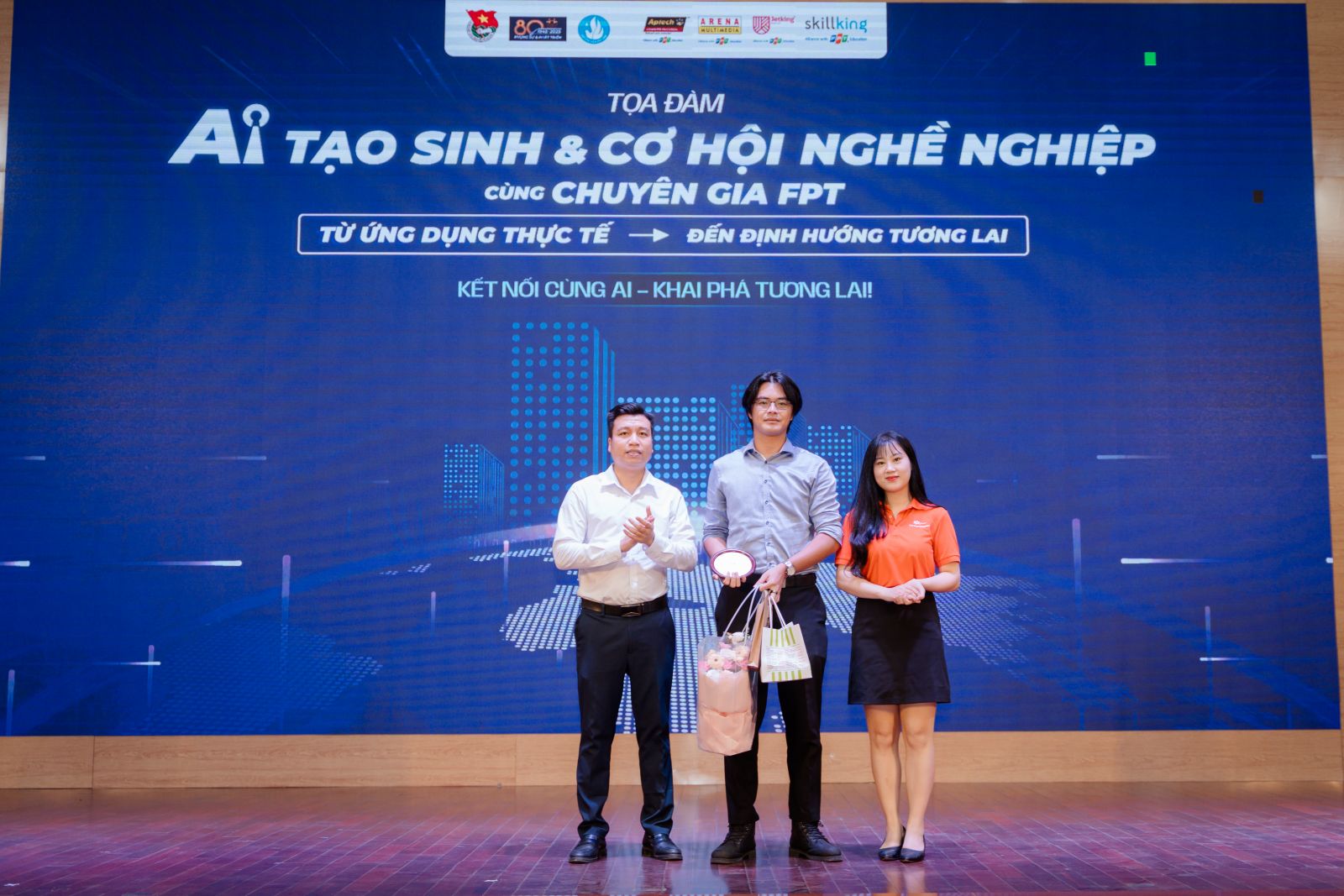 Đồng chí Phùng Công Dũng - Bí thư Đoàn trường cùng đại diện tập đoàn FPT tặng hoa diễn giả