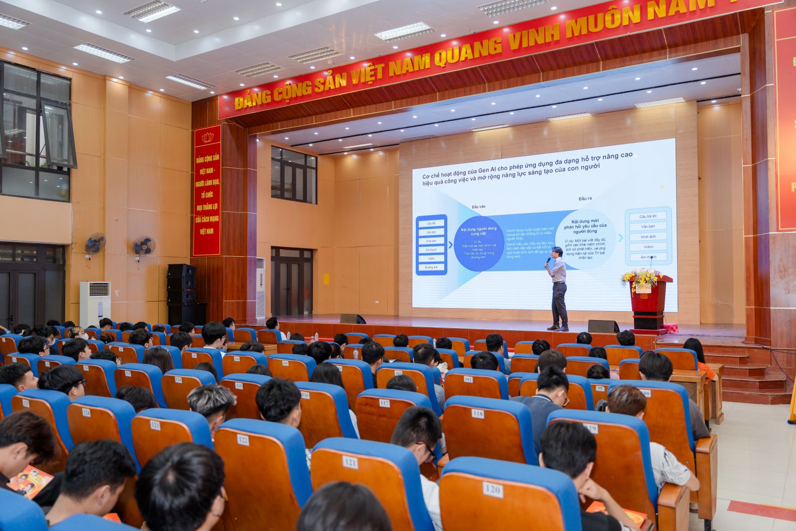 Trong bối cảnh công nghệ AI, đặc biệt là AI tạo sinh đang bùng nổ và thay đổi cách thức làm việc, sáng tạo, ngày 29/5/2025, Đoàn Thanh niên - Hội Sinh viên Trường phối hợp cùng Tập đoàn FPT tổ chức buổi tọa đàm "AI tạo sinh và Cơ hội nghề nghiệp".