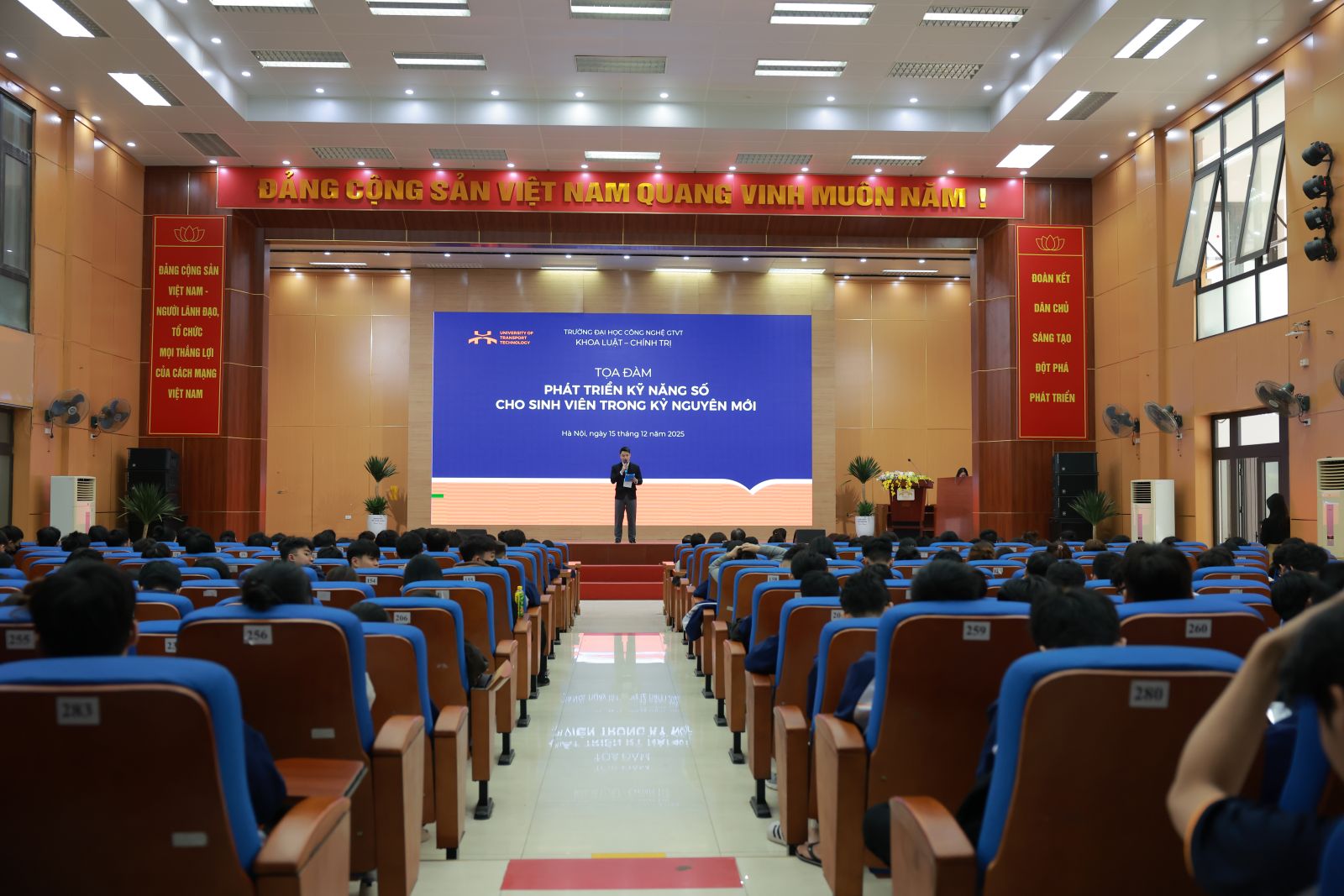 Trong bối cảnh chuyển đổi số diễn ra mạnh mẽ trên mọi lĩnh vực của đời sống xã hội, việc trang bị kỹ năng số cho sinh viên đang trở thành yêu cầu cấp thiết. Ngày 15/12/2025, Khoa Luật – Chính trị, Trường Đại học Công nghệ GTVT (UTT) đã tổ chức tọa đàm “Phát triển kỹ năng số cho sinh viên trong kỷ nguyên mới”, nhằm nâng cao nhận thức và định hướng hành động cho sinh viên trước những yêu cầu của thời đại số. Chương trình thu hút sự tham gia đông đảo của đại diện sinh viên các lớp, các khoa trong toàn trường.