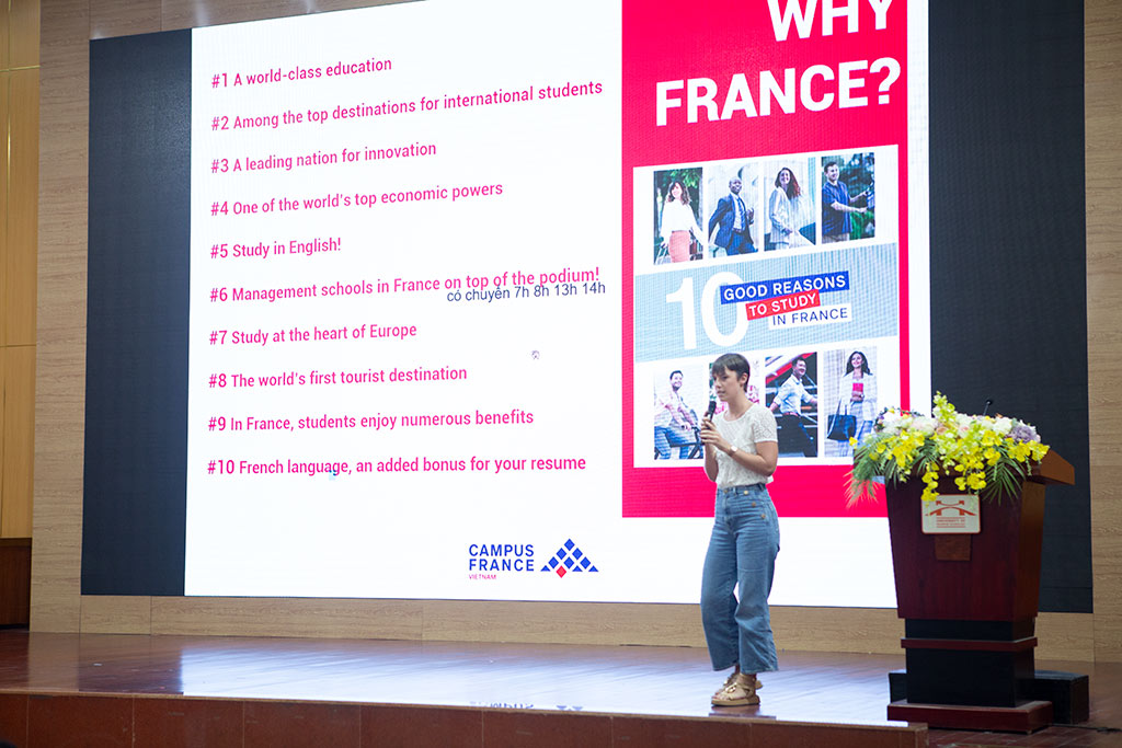 Trong buổi Talkshow, bà Marjorie CELLIER và bà Hoàng Thị Bích Hạnh, đại diện Campus France Việt Nam đã giới thiệu tổng quan về du học Pháp gồm chính sách học phí, sinh hoạt phí, quỹ hỗ trợ nhà ở, những thuận lợi khi sống và học tập tại Pháp. Đồng thời chia sẻ những kinh nghiệm thực tế của bản thân về cuộc sống nơi đất Pháp, các kỹ năng cơ bản cần có của một cá nhân trong xu thế hội nhập quốc tế để các em tự tin làm chủ cuộc sống của chính mình.