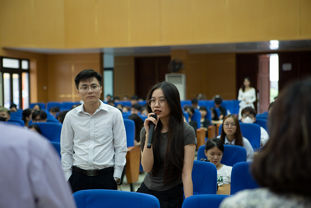 Trong phần giao lưu, trò chuyện với các vị khách mời, các sinh viên cũng đã đặt ra nhiều câu hỏi liên quan đến phương pháp học ngoại ngữ hiệu quả; vấn đề tìm việc làm thêm, thực tập tại Pháp; cộng đồng người Việt ở nước Pháp... được các vị khách mời thông tin một cách chi tiết, đầy đủ.