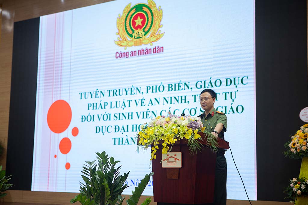 Khách mời tham gia tọa đàm có Thiếu tá, TS. Hà Quang Huy, đại diện CATP Hà Nội. Về phía Nhà trường có TS. Nguyễn Văn Lâm- Phó Hiệu trưởng; đại diện lãnh đạo Phòng đào tạo, Đoàn Thanh niên, Hội sinh viên và đông đảo các em sinh viên của Trường.
