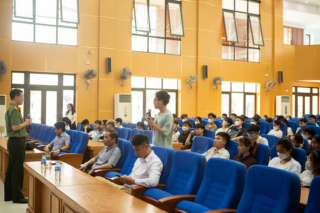 Thiếu tá Hà Quang Huy đã trực tiếp giao lưu, trao đổi với sinh viên để lắng nghe và giải đáp những câu hỏi thắc mắc xoay quanh các vấn đề an toàn thông tin trong thời đại chuyển đổi số: Tại sao thông tin cá nhân như căn cước công dân, số điện thoại lại bị đối tượng xấu đánh cắp? Cách xử lý tình huống khi bị mạo danh cơ quan chức năng giả danh gọi điện? Các đối tượng đăng tin giả hoặc không chính thống lên mạng xã hội có vi phạm pháp luật không?