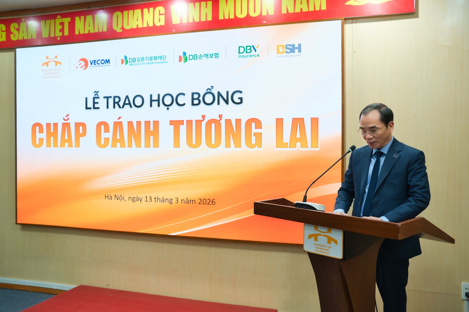 Ngày 13/3/2026, tại Trường Đại học Công nghệ GTVT đã diễn ra Lễ trao học bổng thuộc Dự án “Học bổng cho 15 trường đại học là thành viên của Hiệp hội Thương mại điện tử Việt Nam” do Hiệp hội Thương mại điện tử Việt Nam (VECOM) phối hợp cùng Tổng Công ty Cổ phần Bảo hiểm Sài Gòn – Hà Nội (BSH) triển khai.