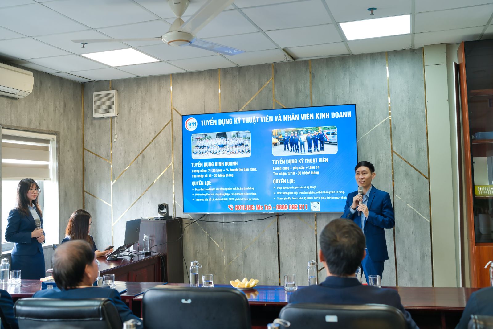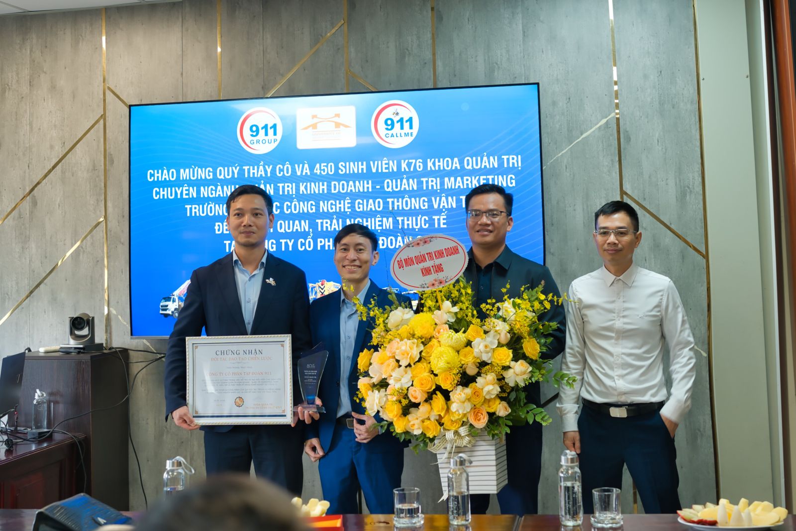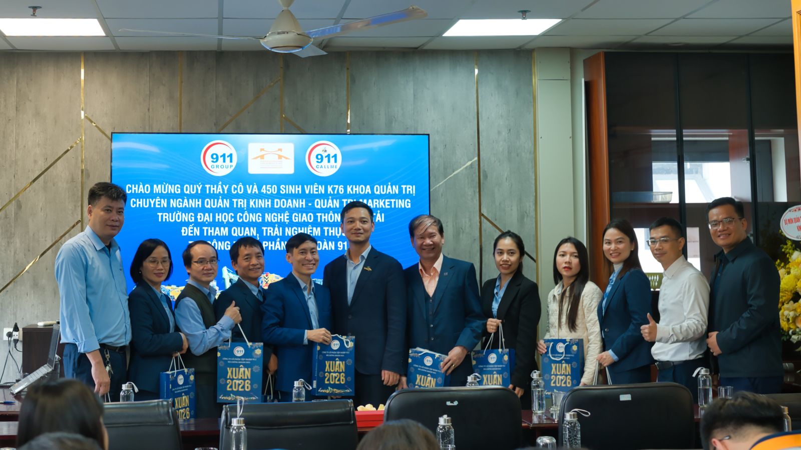 Điểm đến đầu tiên của đoàn là Tập đoàn 911 (911 Group) – doanh nghiệp Việt Nam hoạt động trong lĩnh vực kinh doanh, cho thuê thiết bị xây dựng và máy móc thi công. Tại đây, sinh viên được giới thiệu tổng quan về quá trình hình thành và phát triển của doanh nghiệp, mô hình công ty cổ phần với mã chứng khoán NO1, cùng chiến lược mở rộng sang lĩnh vực vận tải hành khách bằng taxi điện thông qua Công ty Cổ phần Vận tải và Dịch vụ 911 Group Future.